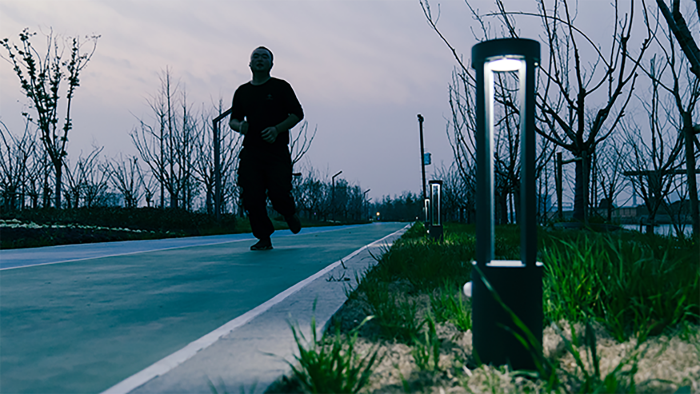 绿道沿途还设置106组智慧伴跑灯,夜晚,灯光会随着跑步者的步伐,自动亮起,不仅让公园的夜景更丰富立体,也为更多的夜跑 爱好者增添了互动乐趣。 步道沿途设置了三组互动灯景竞跑屏。它凭借精准的雷达捕获技术 与户外LED智慧屏的结合,在无人正面通过的情况下,屏幕自动循环播放公园定制的视频内容:当市民从屏幕正面经过时,虚拟人 影粒子便可跟随运动者一起移动变幻。大屏还可设置配速显示,支 持五人同时互动,炫酷的画面,科技感十足,相信一定会成为公园里的网红人气驻留地。